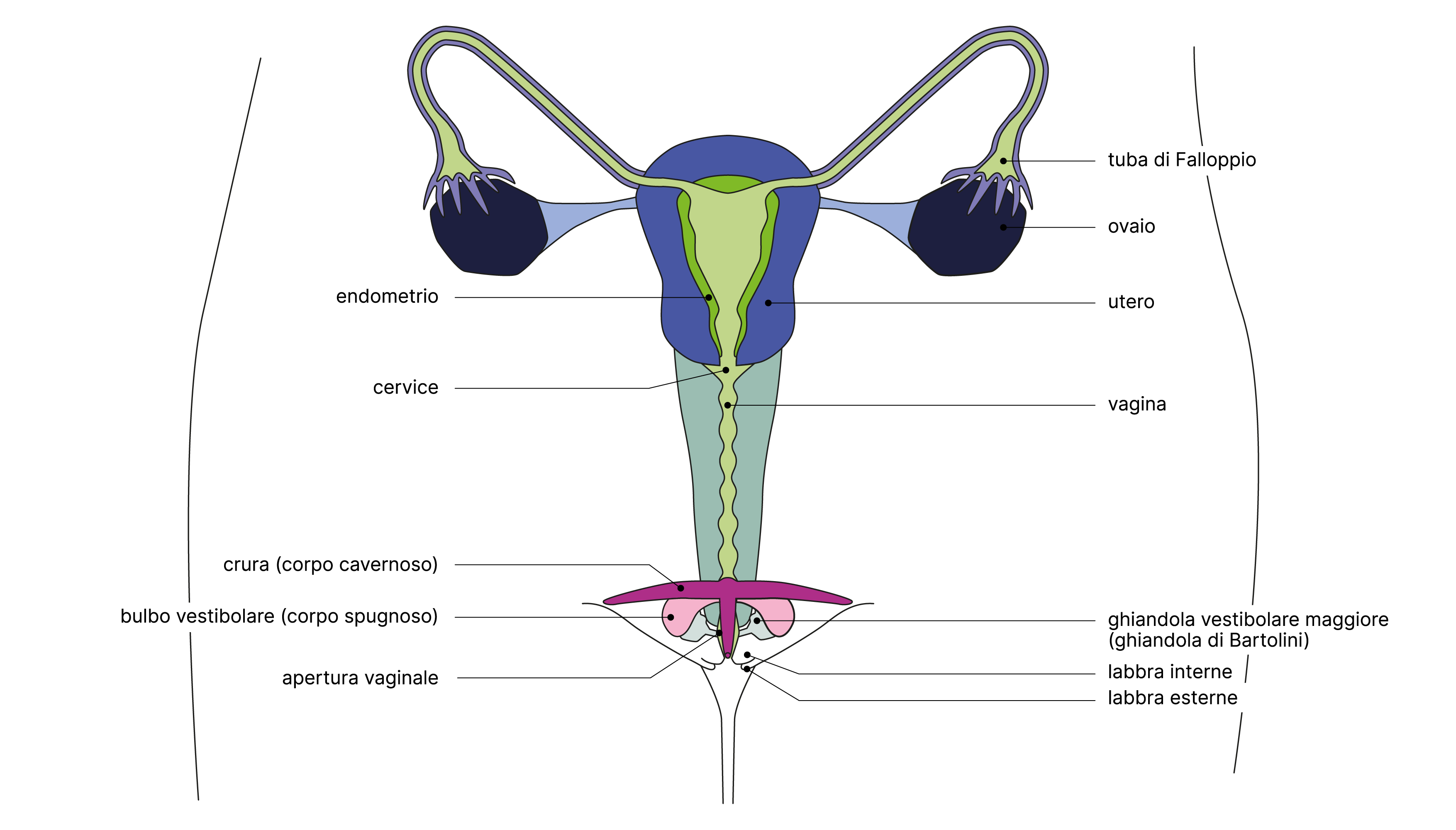 I genitali esterni comprendono la vulva (che a sua volta include le piccole e le grandi labbra e l’ingresso della vagina) e la parte visibile del clitoride.