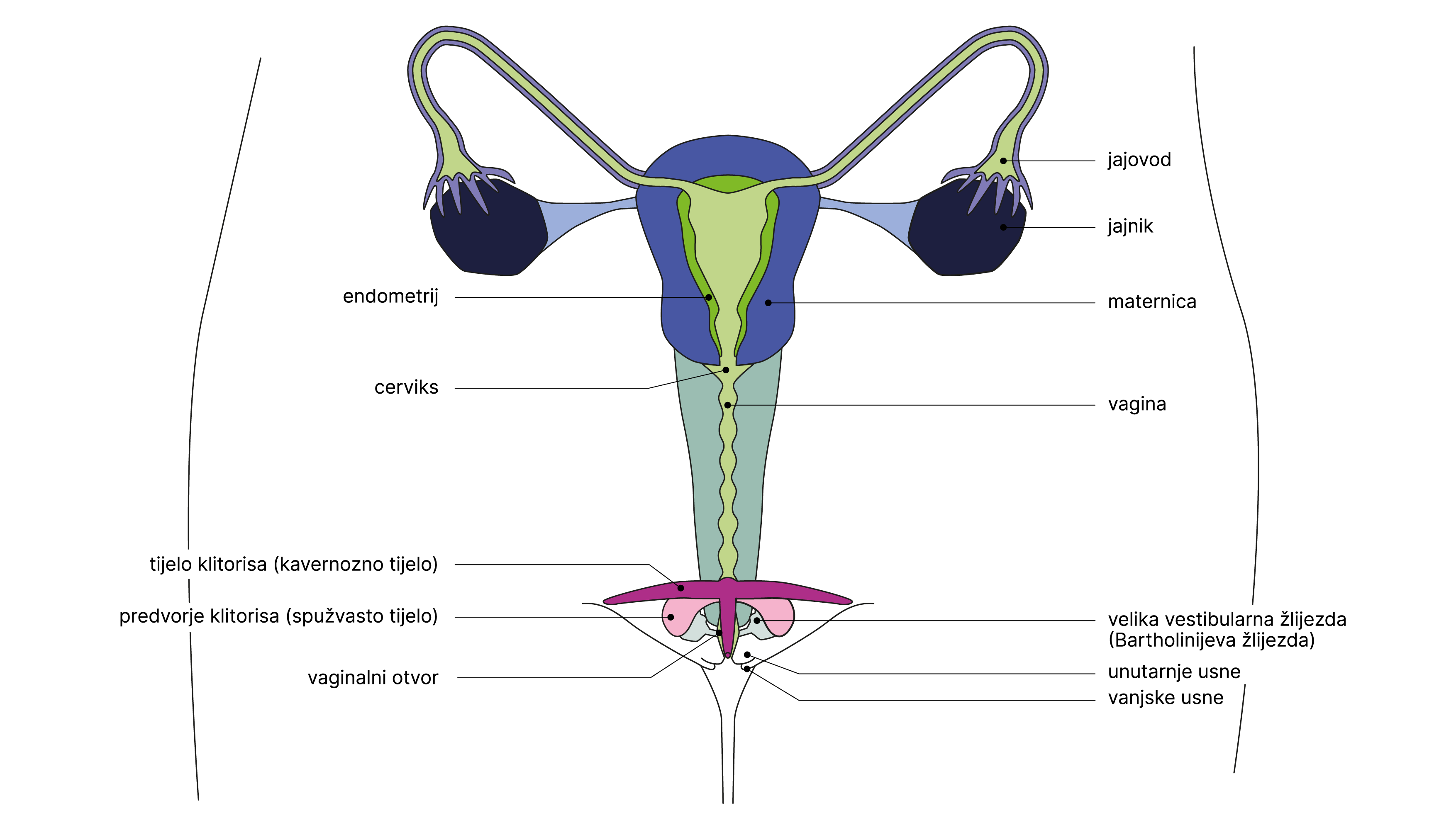 Ove ilustracije su shematski dijagrami genitalija i ne odražavaju njihovu stvarnu raznolikost. Izgled genitalija varira od osobe do osobe.